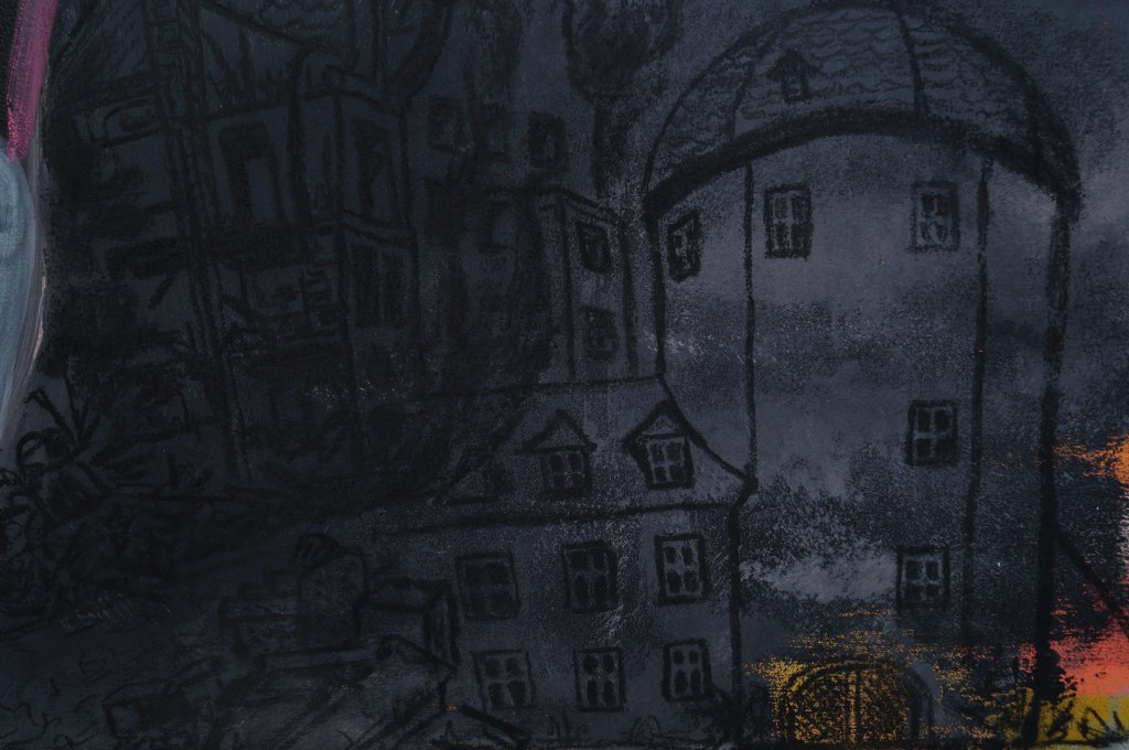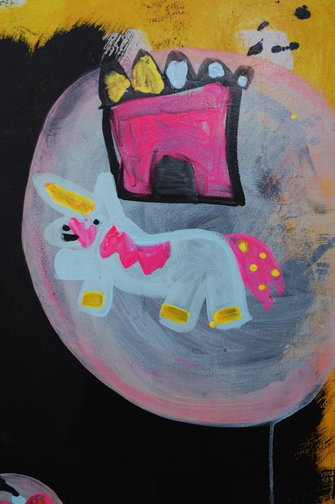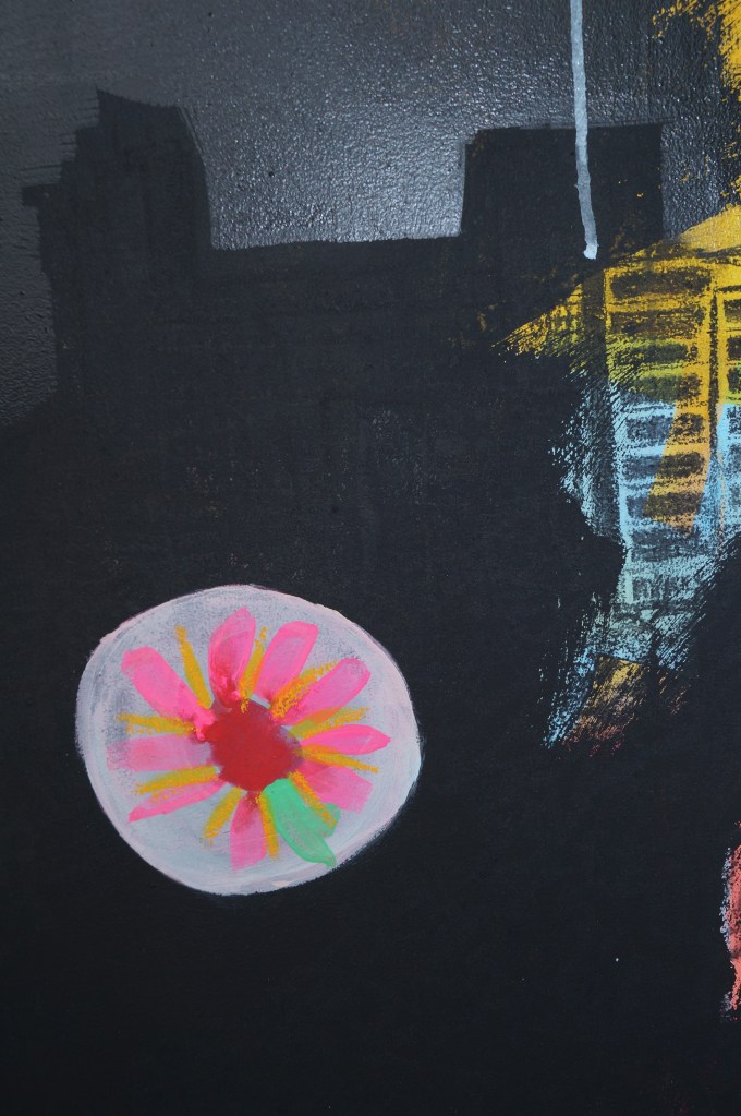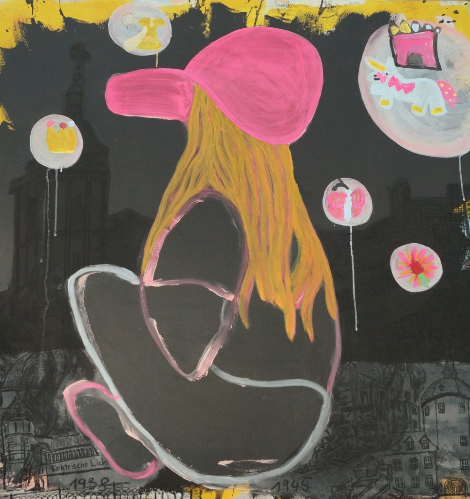 „dream big little one“ ist nicht nur das derzeit aktuellste Kunstwerk, es ist auch das bisher einzige, das beide Stile miteinander verbindet. Ich habe hier zum ersten Mal die Methode meiner bunten Serie (Malen mit der Farbrolle) mit der Verwendung von Holzkohle (schwarze Serie) verbunden. Die Idee dazu kam mir, als der Title unserer diesjährigen Frühjahresausstellung der ASK feststand: „es war- es ist- es wird sein“. Dieser Titel, der u.a. auf das 800 Jubiläum der Stadt Siegen in diesem Jahr Bezug nahm, inspirierte mich dazu, Schlüsselmomente der Vergangenheit meiner Geburtsstadt sowie Gegenwärtiges als auch Zukünftiges in diesem Bild miteinander zu verbinden. Zwei bedeutsame geschichtlichen Ereignisse Siegens erkennt man im unteren Bildrand, wo ich links den Brand der jüdischen Synagoge im Jahre 1938 darstellte, sowie die Zerstörung Siegens durch den Zweiten Weltkrieg 1945 rechts im Bild. Im Mittelgrund des Bildes erkennt man die gegenwärtigen Wahrzeichen Siegens: das sogenannte „Krönchen“ (Nikolaikirche) links im Bild, sowie das Gebäude der Universität Siegen (rechts im Bild); ein weiteres Wahrzeichen, der sogenannte „Dicke Turm“ befindet sich ganz unten in der rechten Bildecke. Im Mittelpunkt des Bildes erscheint konturhaft eine Person, die aufgrund ihrer langen Haare und Proportionen als ein junges Mädchen mit Baseballkappe identifiziert werden kann. Sie sitzt dort im Schneidersitz und scheint in die Ferne zu gucken; womöglich denkt oder träumt sie so vor sich hin, was die einzelnen Seifenblasen um sie herum andeuten. Diese Seifenblasen stellen das Zukünftige dar, was wir uns nur erdenken oder erträumen können, genauso wie es das junge Mädchen tut. Wovon junge Mädchen so träumen, stellte meine 6jährige Tochter malerisch dar, was ebenfalls eine Neuheit ist.