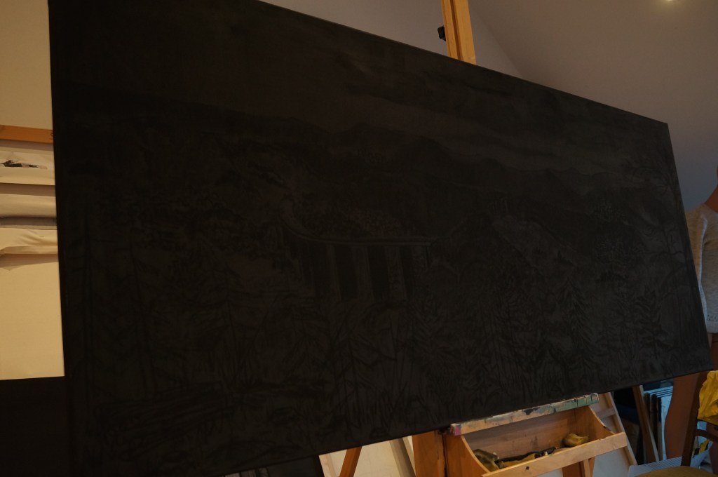 80×200 cm, Holzkohle auf schwarz grundierter Leinwand, 2022