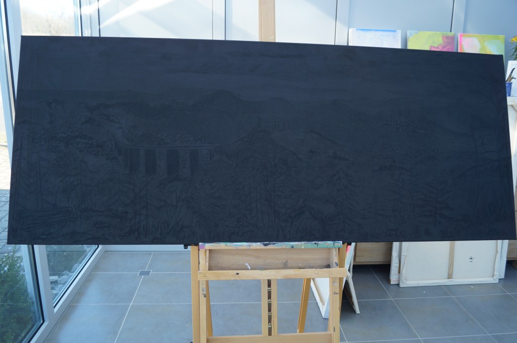 Das Panorama „everything has its ´time“ zeigt die Aussicht auf die Stadt Siegen mit ihrer markanten Eiserfelder oder auch Siegerland Brücke genannten Autobahnbrücke sowie den umliegenden Ortschaften. Hier treffen Pandemie, das Waldsterben aufgrund der Borkenkäfer-Krise und die Tatsache, dass alles im Leben irgendwann ein Ende hat, zusammen (die Eiserfelder-Brücke wird in absehbarer Zeit abgerissen). Bei einem Spaziergang fiel mir dieser Ausblick ins Auge, der zuvor durch hohe Bäume und Wälder verdeckt war und ich empfand etwas Traurigkeit und Wehmut obwohl ich mich gleichzeitig auch über den wunderschönen Weitblick freute. „Alles hat seine Zeit“ – so eben auch eine Pandemie, ein Baum und eine Brücke; alles (ver-)geht zu seiner Zeit. Dieses Bewusstsein der Vergänglichkeit drückt sich nicht nur im gewählten Bildausschnitt aus, sondern auch in der besonderen Maltechnik: die Holzkohle ist ebenfalls ein vergängliches Material, denn ohne ein entsprechendes Fixativ würde auch sie vergehen.