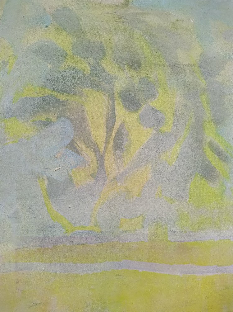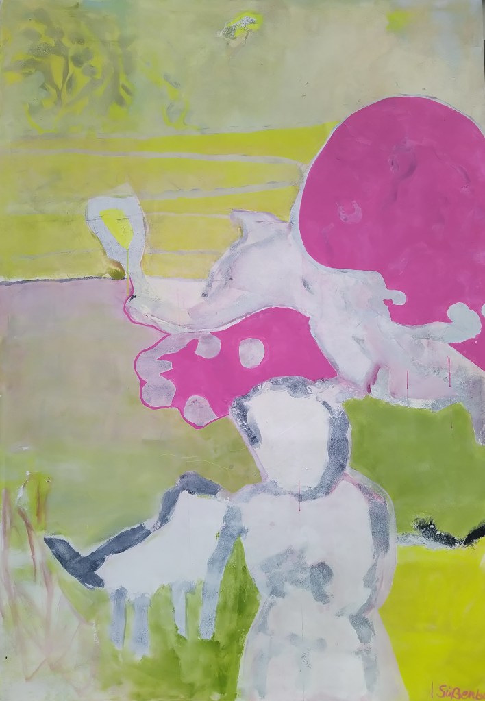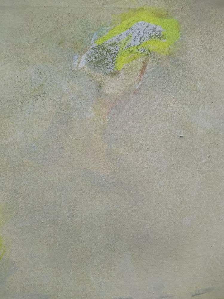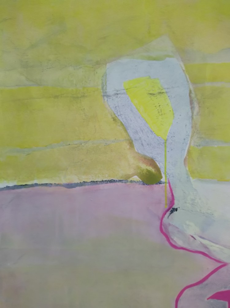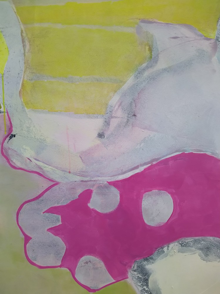 „head in clouds“ zählt zu meinen absoluten Lieblingsbildern! Wo fange ich an? Mir gefällt total gut, wie die Figuren im Bild sitzen, nicht genau mittig, sondern eher etwas nach unten versetzt; mir gefällt, wie sich der Hintergrund aufbaut, vor der gelben Horizontalen Fläche erstrecken sich Formen, die schwer zu identifizieren sind und somit Raum für Assoziationen lassen. Darin steckt auch eine gewisse Verspieltheit, die aufgrund ihrer Farbgebung gute Laune und Fröhlichkeit verbreitet. Oberhalb der gelben horizontalen Linien scheint eine Art Strauch oder Baum emporzuwachsen, der aber, umgeben von zarten Hellblautönen, nur leicht durchschimmert. Das pinke Gebilde am rechten Bildrand bleibt undefiniert und geheimnisvoll und sticht mit seiner kräftigen Farbe hervor. Es bildet somit einen Kontrast zu den Figuren im Vordergrund, die akzentuiert sind, jedoch mit einer Art „Schleier“ überdeckt wurden, der ihre schwarze Kontur nur schemenhaft erkennen lässt. Stellenweise erinnern mich die zwei Figuren an Aufkleber, da sie schon fast wie „aufgeklebt“ oder in die Szenerie eingesetzt wirken obwohl sie von mir als erstes mit der Farbrolle festgehalten wurden.