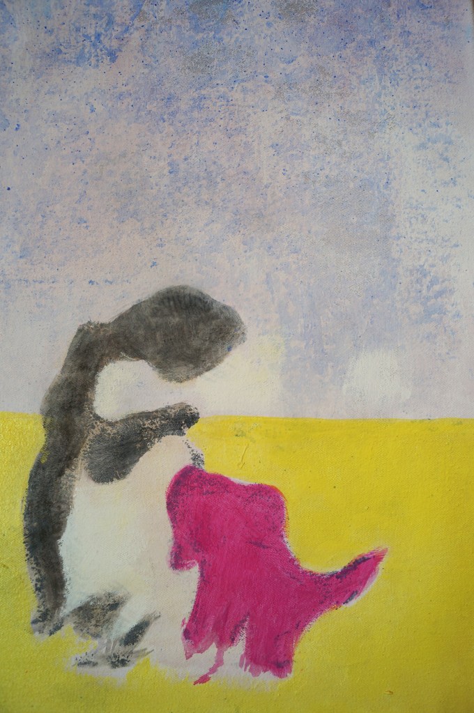 Das Bild handelt von Regen und Sonnenschein, von Trübsinnigkeit und Heiterkeit. Beides liegt oft so nah beieinander und manchmal erleben wir sogar ein Wechselbad der Gefühle. Das Bild strahlt Frohsinn und Hoffnung aus, auch wenn es gerade metaphorisch gesprochen „regnet“. Die Farben Blau, Gelb, Schwarz und Pink spiegeln diese Gefühle wider.